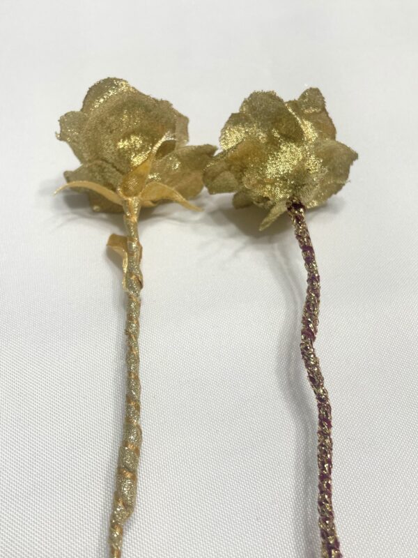 Crafted from shimmering golden fabric, each petal unfolds with a radiant glow, reminiscent of the legendary Midas touch. Complementing its luminous bloom is the sparkling gold stem, adding an extra dimension of opulence. This exquisite rose is perfect for those moments that demand a touch of golden magic.
